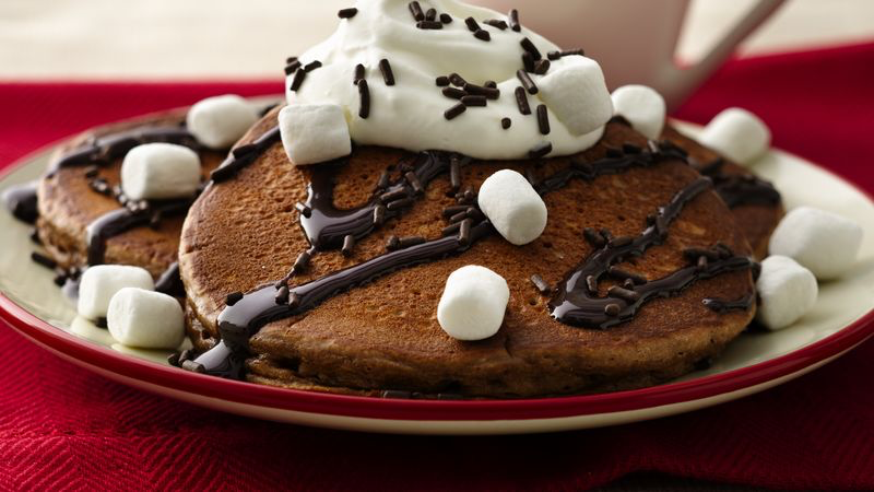 To make these quick hot chocolate pancakes from Betty Crocker, start with Bisquick mix. Add in sugar, cocoa powder, eggs, vanilla and chocolate milk. Once cooked these pancakes taste like warm hot chocolate you can eat with a fork! Drizzle with chocolate syrup for an extra dose of sweetness.