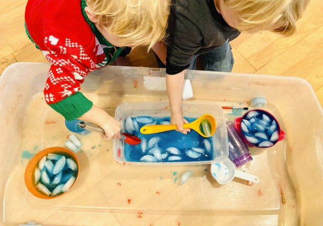 - Make an ice bin: Ice cubes, water, food coloring and a spoon or plastic shovel are all you need to make this cool sensory bin.